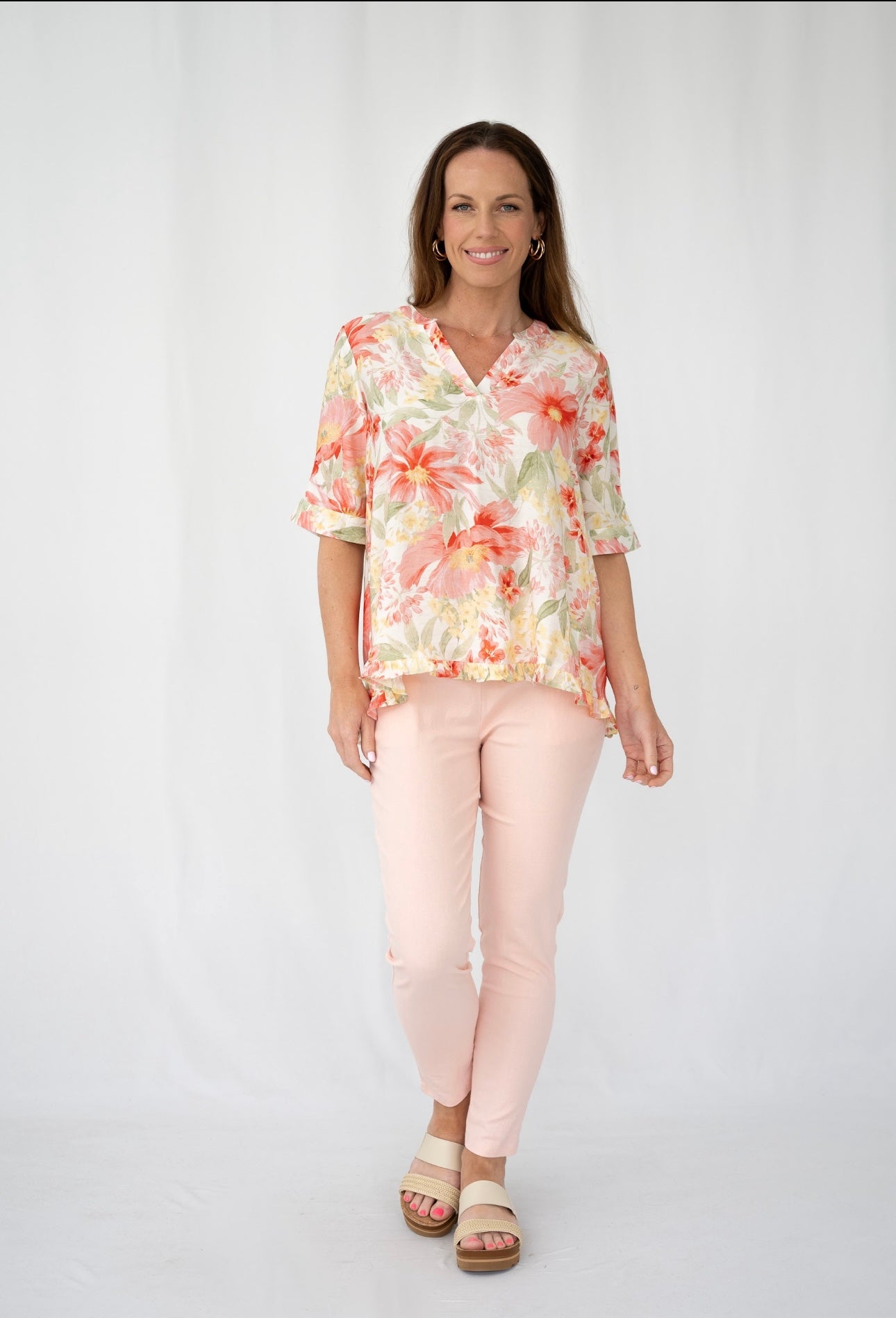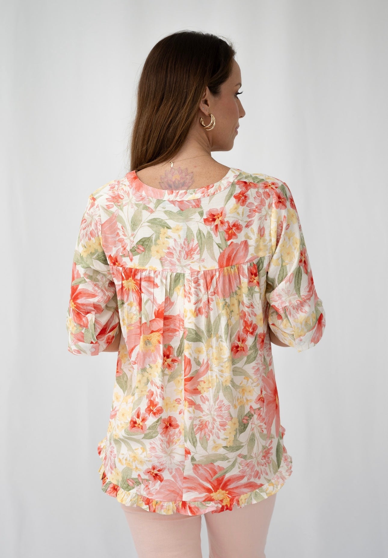 The VIETTA TOP is a versatile addition to your wardrobe. With a multi red floral print and v neckline, it is perfect for every season. The curved frill hem and cuffed sleeve add a touch of uniqueness to this top. Elevate your style with this must-have piece.