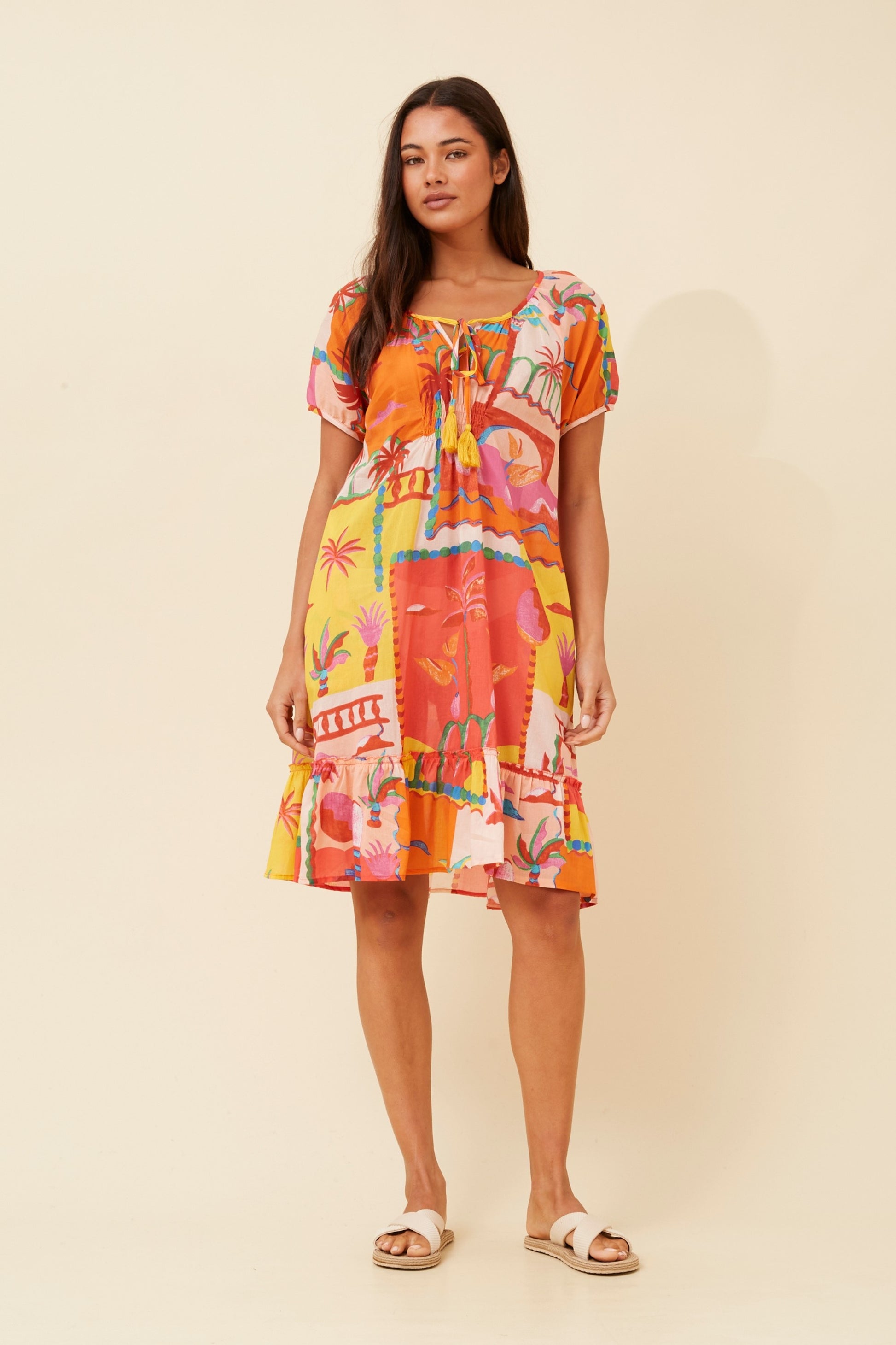 The SABRINA MINI DRESS features an exclusive multi coloured print and a flattering v-neck tie design. With the added convenience of side pockets, this dress is perfect for any occasion. The short puff sleeves add a touch of elegance to this versatile and chic piece.