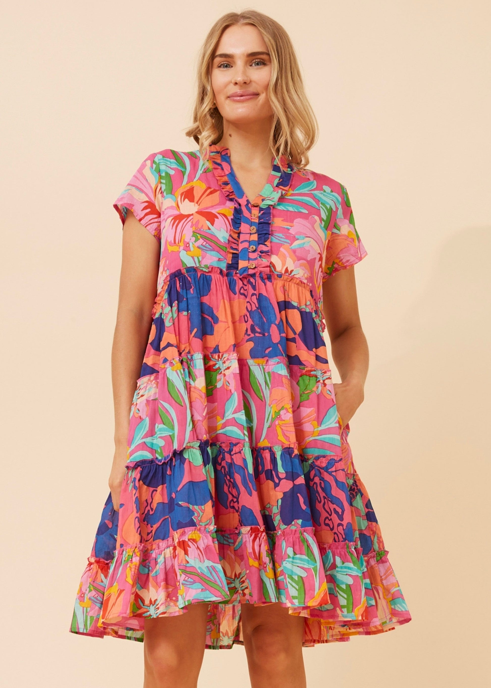 The KEISHA MINI DRESS in PINK features a delicate floral print, v neckline, and convenient side pockets. With short sleeves and frill detailing, this dress is both functional and stylish, adding a touch of feminine charm to your wardrobe. Stay comfortable and fashionable with this versatile piece.