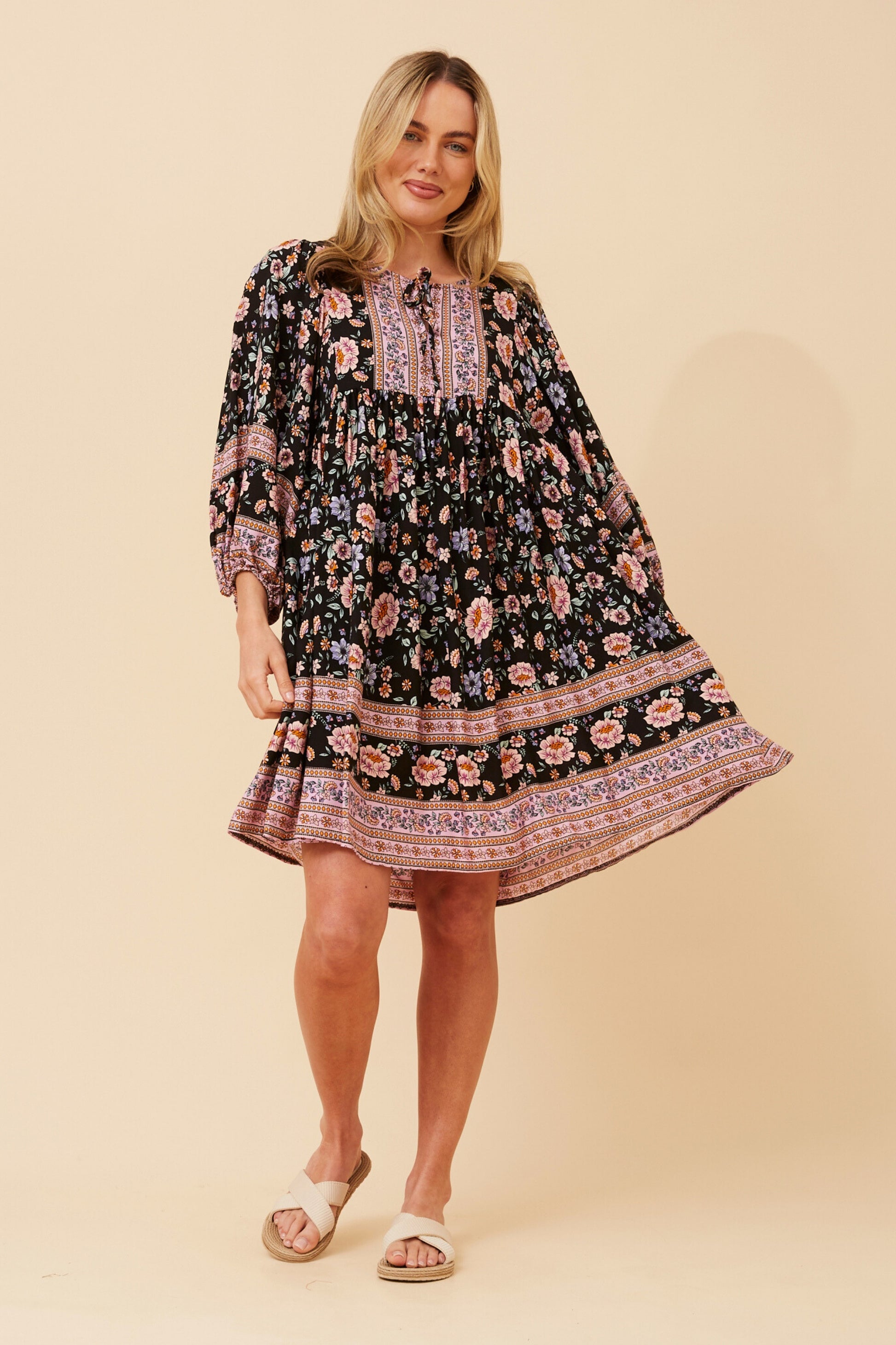 The GRACIA MINI DRESS features eye catching floral print and a v-neck tie design. With the added convenience of side pockets and stylish stitch detailing, this dress is perfect for any occasion.