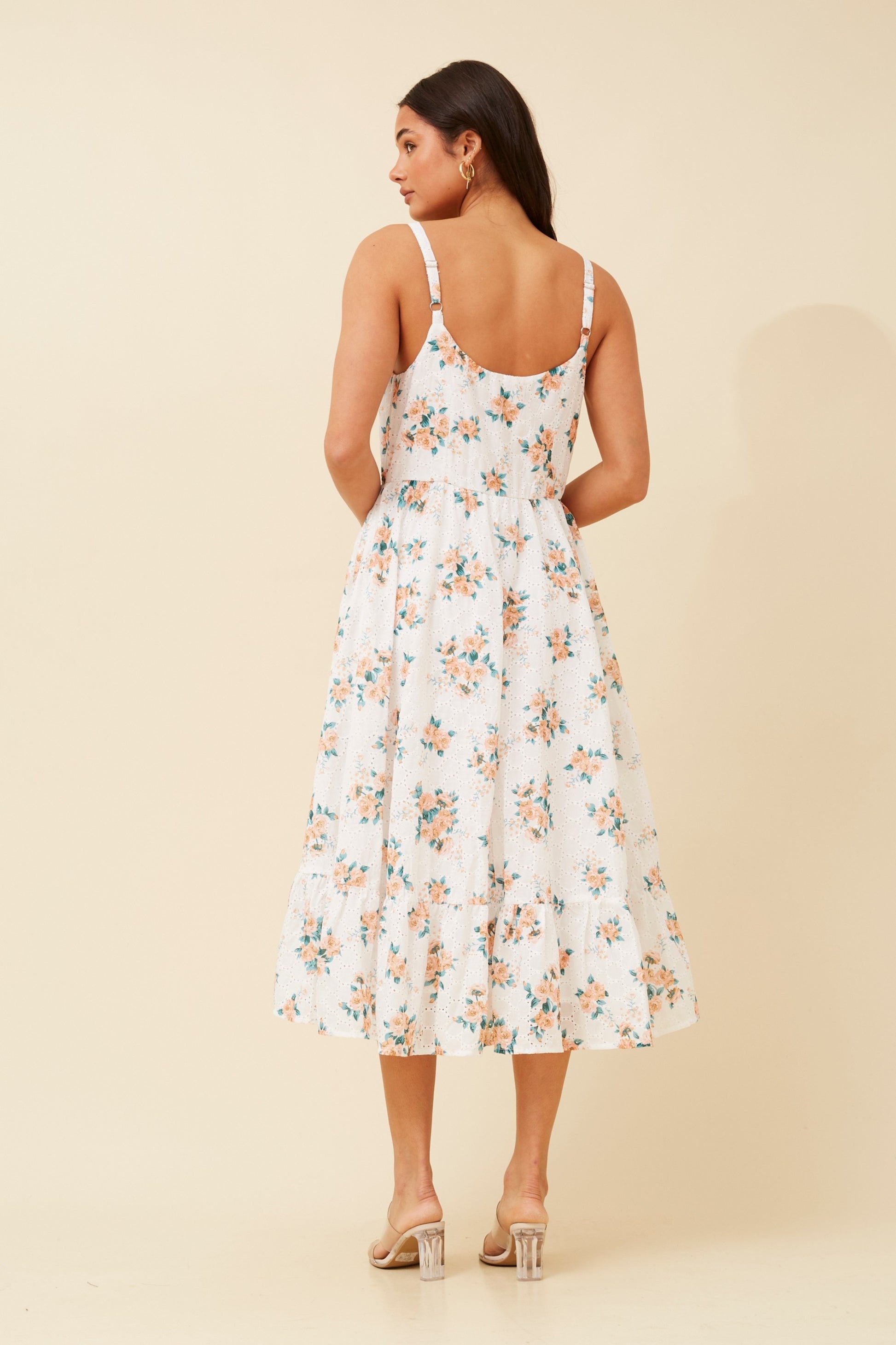 Our SERAH MIDI DRESS boasts a flattering button front and adjustable straps. With an elastic waist detail, it accentuates your figure for a beautiful, feminine silhouette. Perfect for any occasion with its timeless style and versatility.