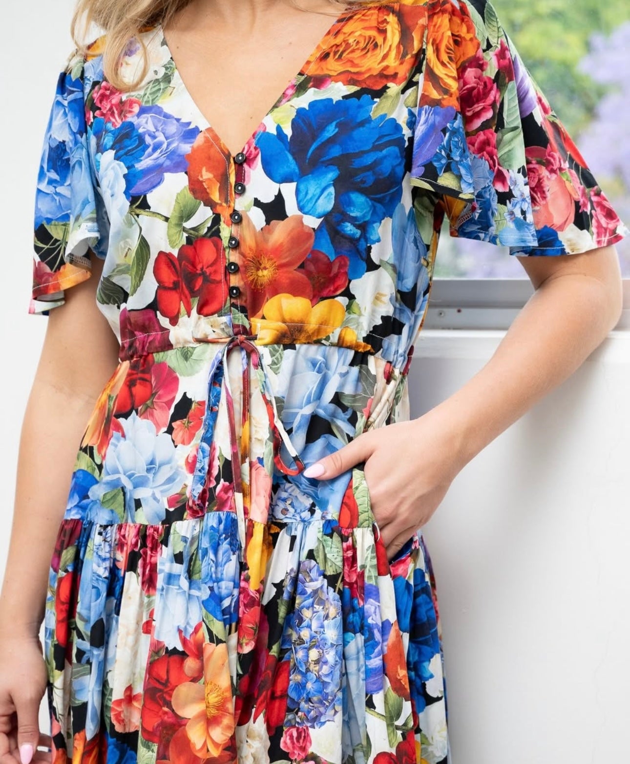 Expertly designed for style and comfort, the KIERRA MINI DRESS boasts a multi coloured vibrant floral print, button front detail, and stylish curved hem. Complete with a drawstring waist for a flattering fit, this dress is perfect for any occasion. Elevate your wardrobe with this must-have piece.