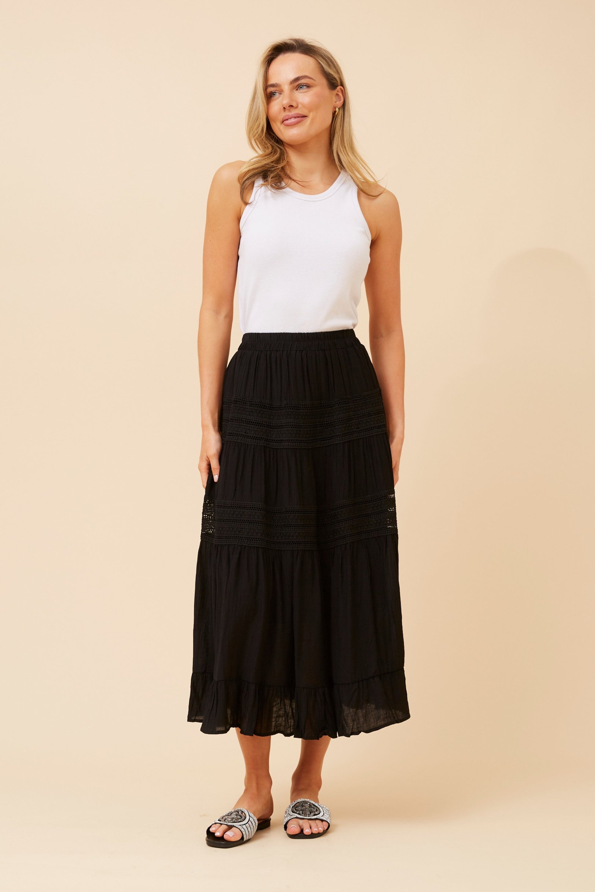 The LAINEY SKIRT in BLACK is the perfect addition to your summer wardrobe with its delicate lace panel detail and luxurious cotton fabric. The stylish tiered design and elastic waist add a touch of elegance to this feminine piece.