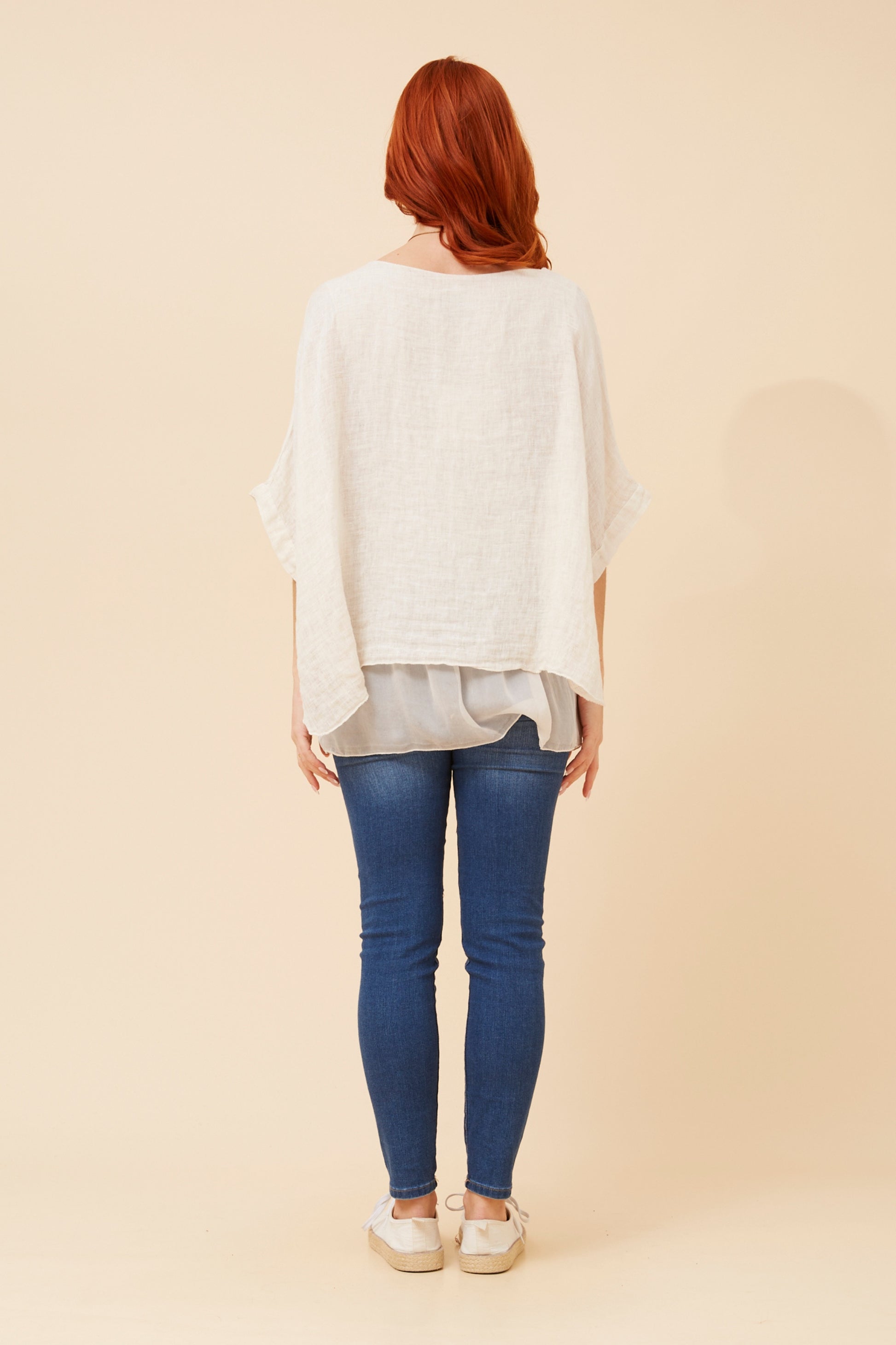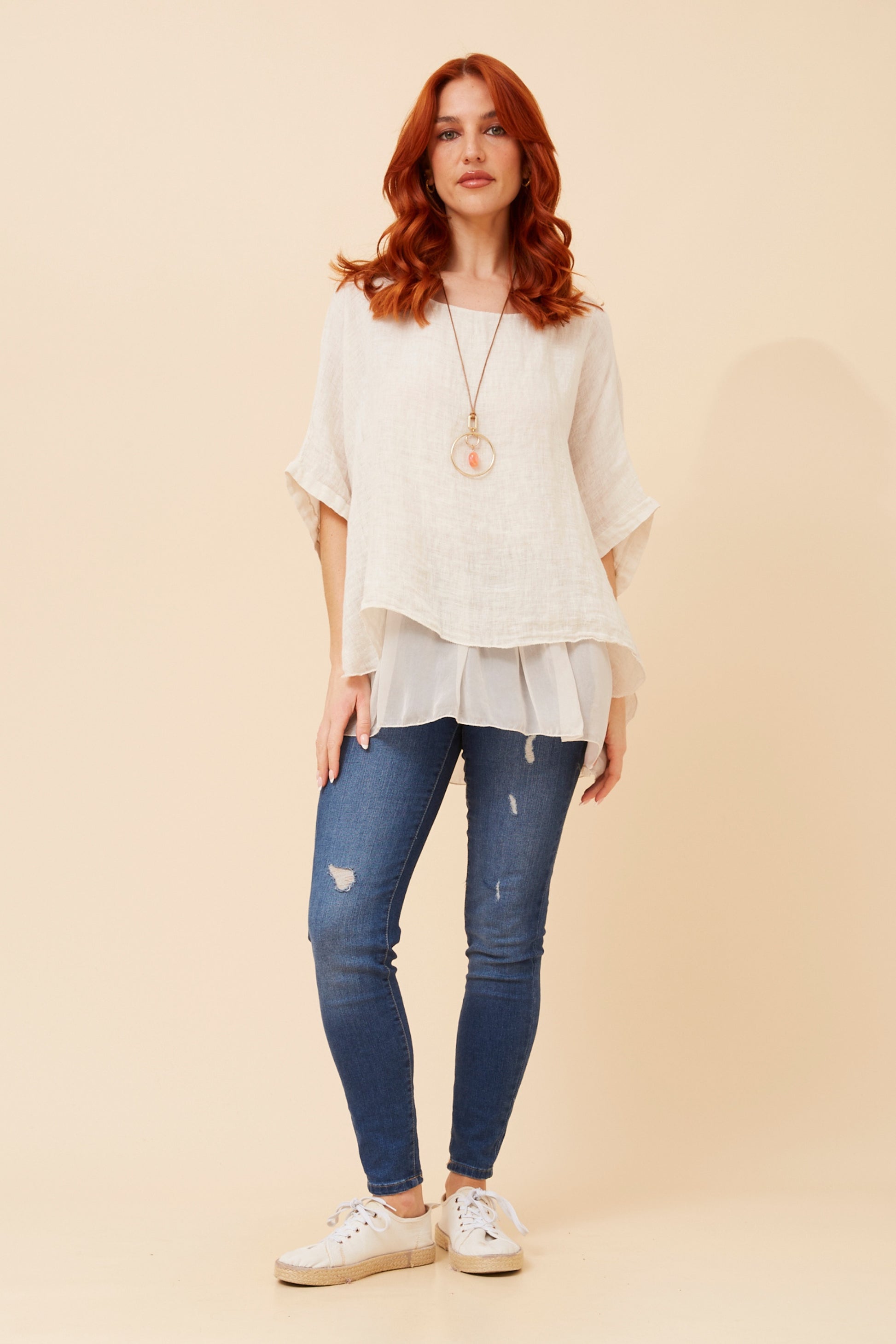 Stay stylish with our DENISE TOP in SAND. Adorned with a luxurious fabric, this top features a charming round neckline and bold jewel necklace. The roll sleeves and doubke layer design add a touch of sophistication to this unique and eye-catching piece.
