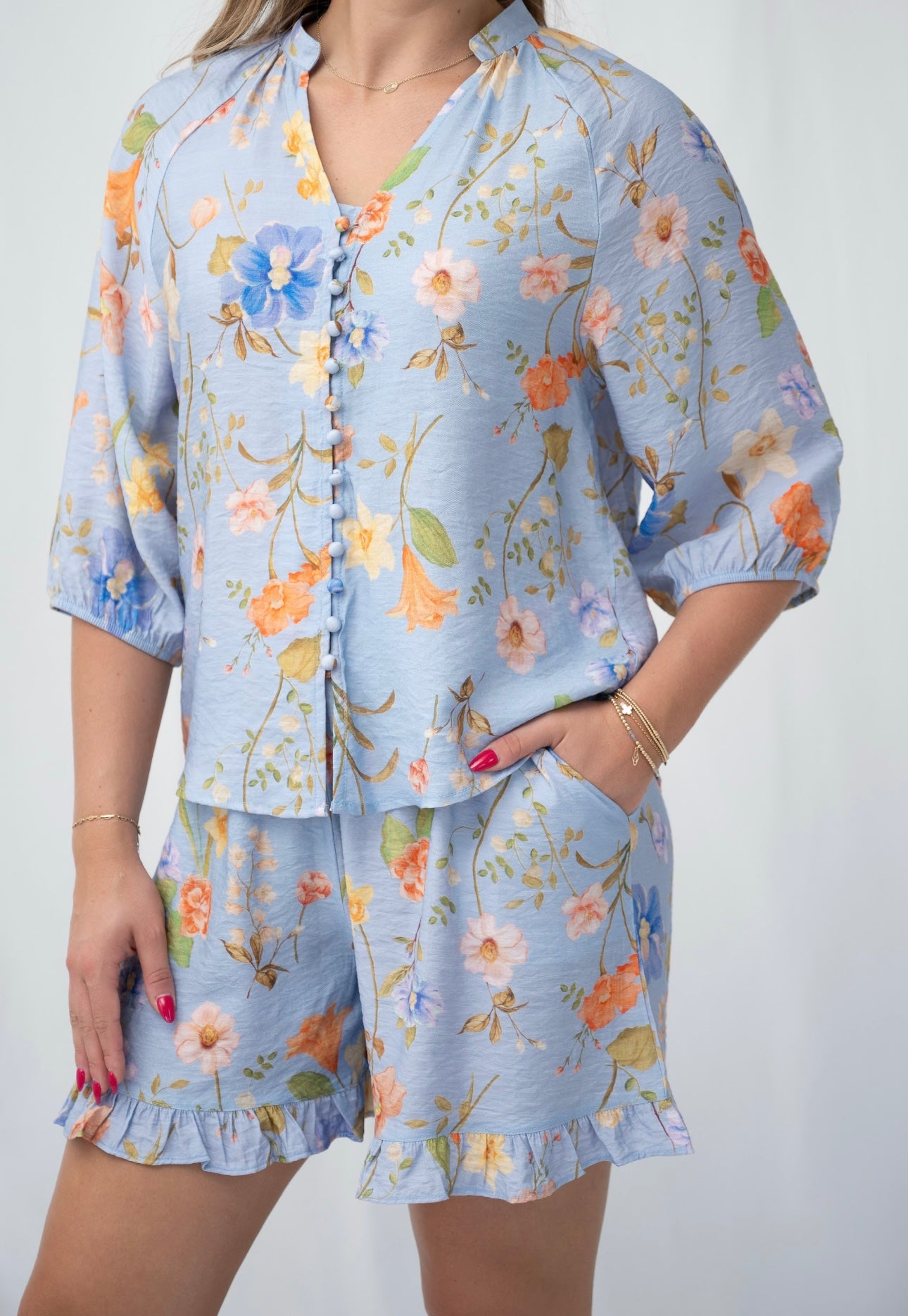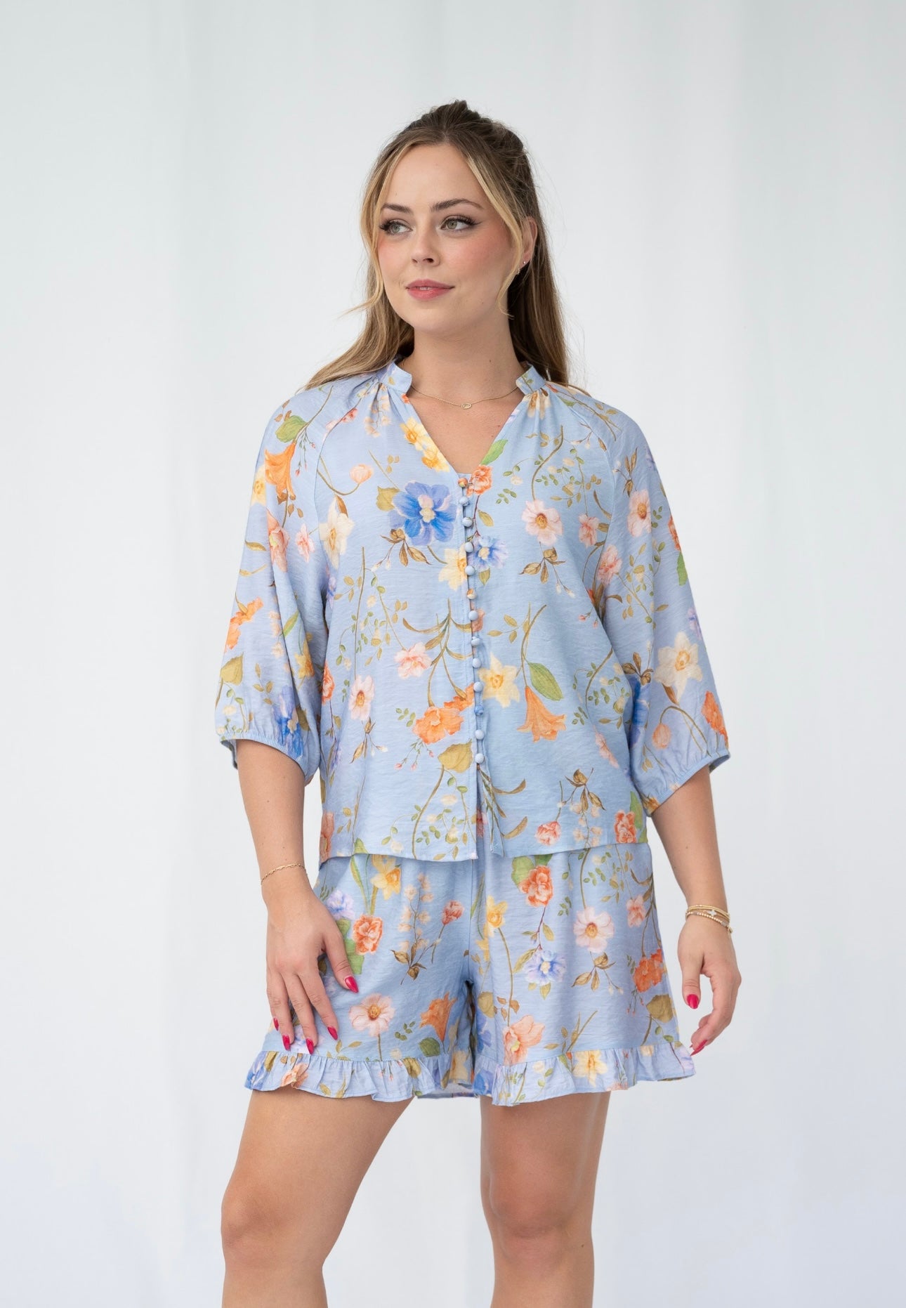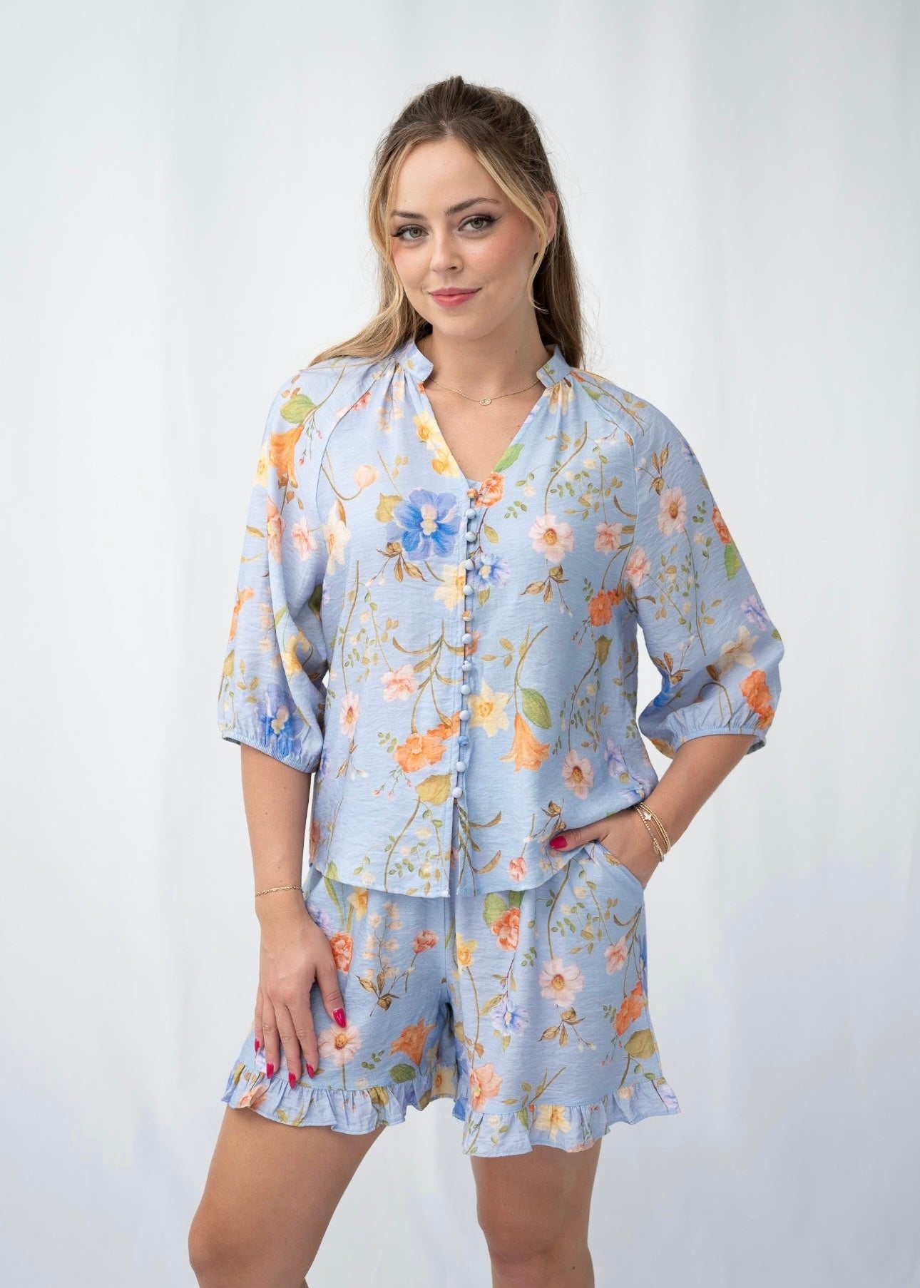 The KILEY TOP offers a delicate blue floral print, complemented by the addition of a v neckline, 3/4 elastic sleeves and stylish button front. Elevate any look with this charming top that exudes feminine charm.