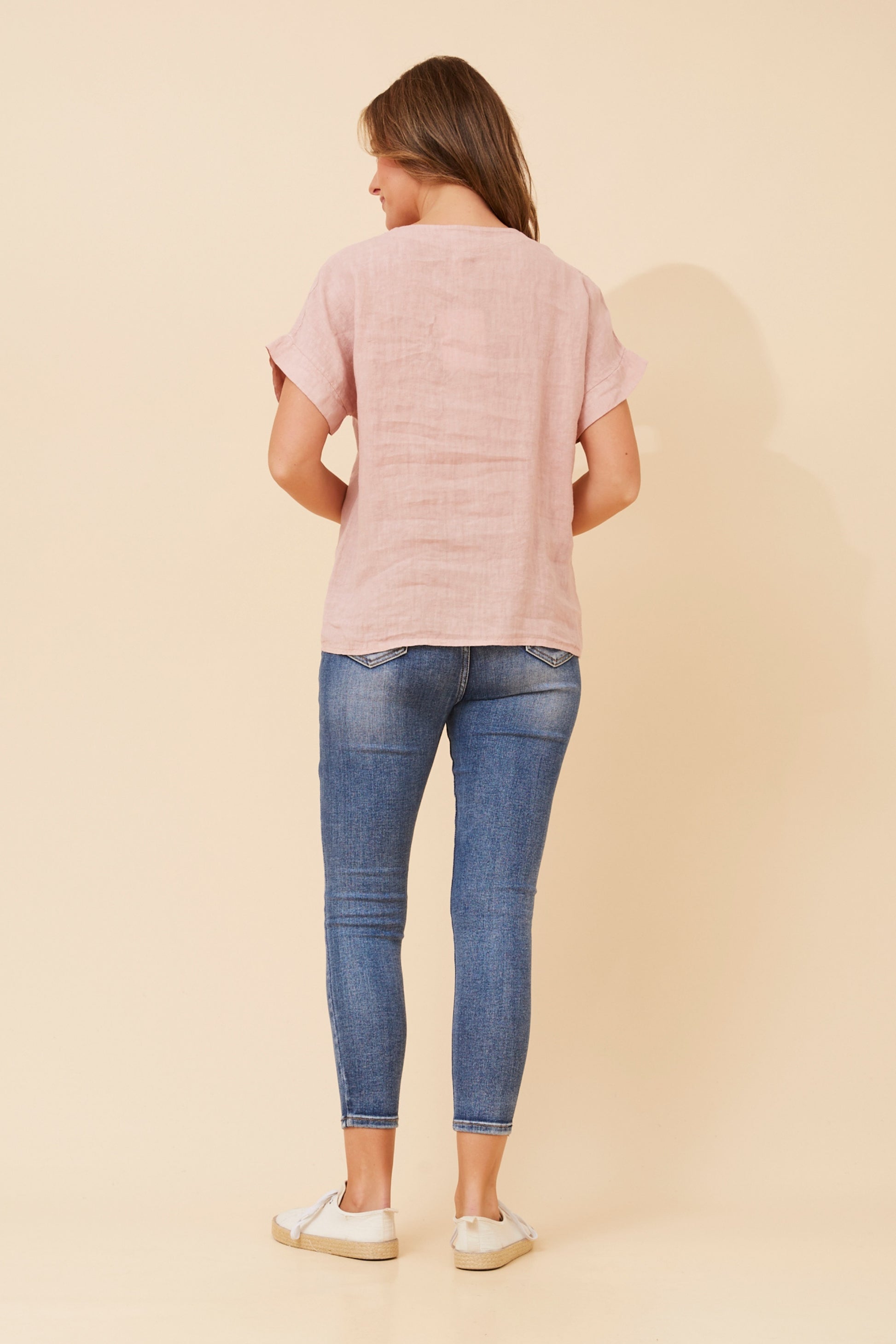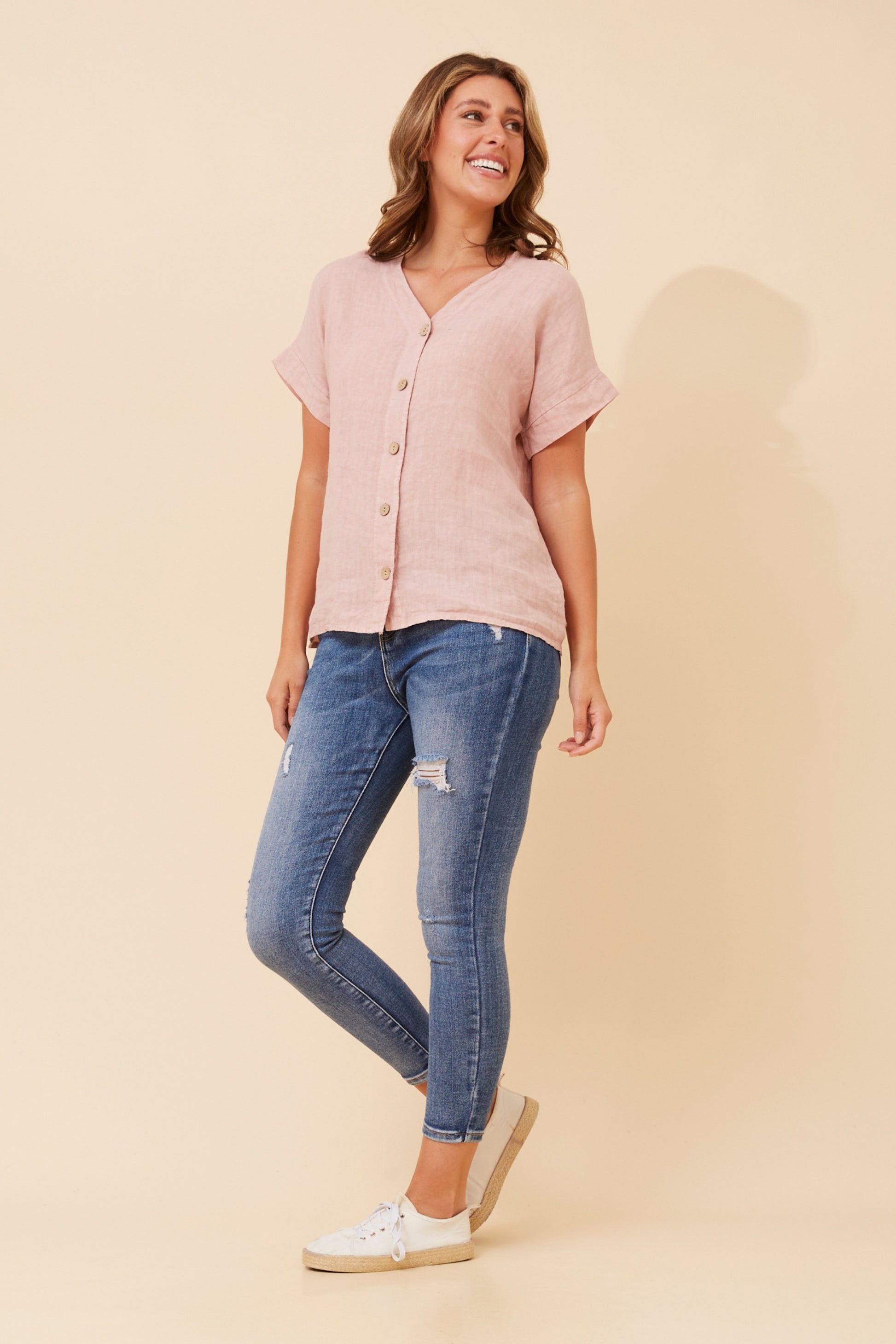 The KERRY TOP in FONDATINTA is the perfect top for your everyday wardrobe. Made with cotton and featuring a flattering v-neckline, it is designed for both comfort and style. The button detail adds a touch of sophistication to this short-sleeved top. Elevate your look with the KERRY TOP.