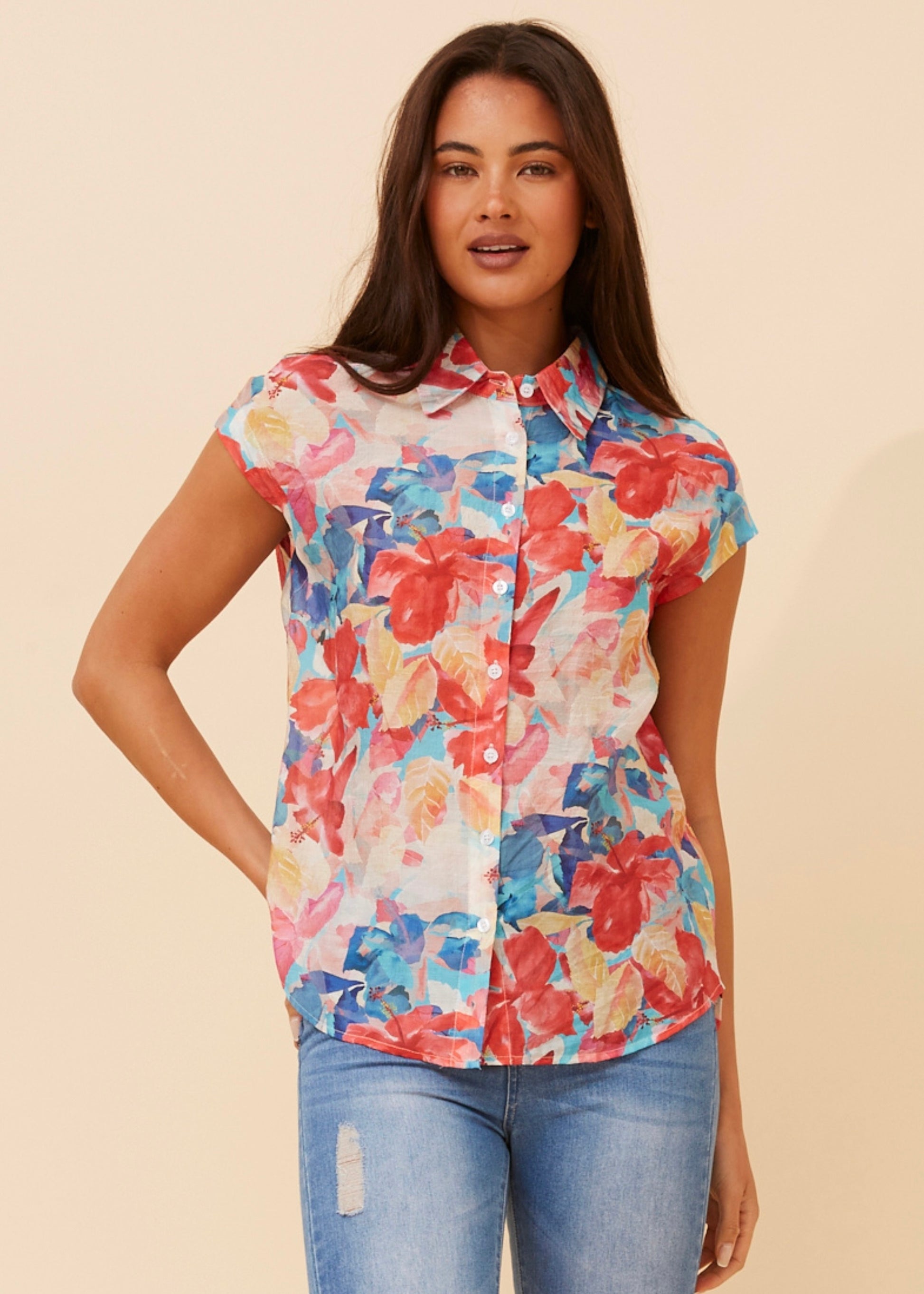 The SHAUNA TOP in RED features an eye-catching print and a trendy collar neckline. The short sleeve design adds a touch of sophistication while the curved hem and button front keep it versatile. Upgrade your wardrobe with this stylish and comfortable top.